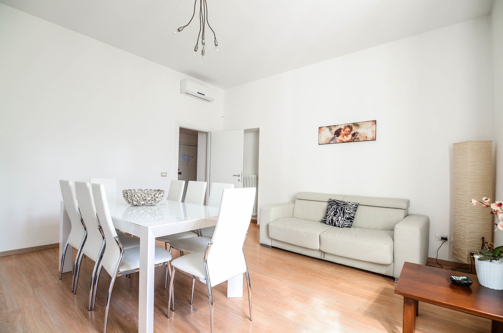 Die geräumige Lounge ist mit einem 8-Sitzer-Ledersofa ausgestattet und wird durch die 2 Fenster mit natürlichem Licht durchflutet. Sie bietet Blick auf den See und den Fährhafen - ein idealer Ort, um das Panorama des Comer Sees zu bewundern.