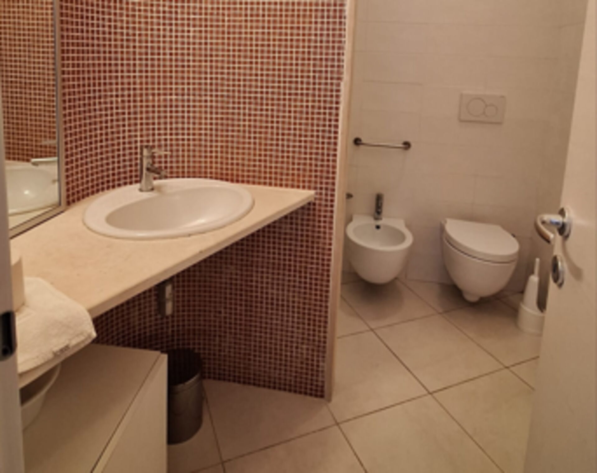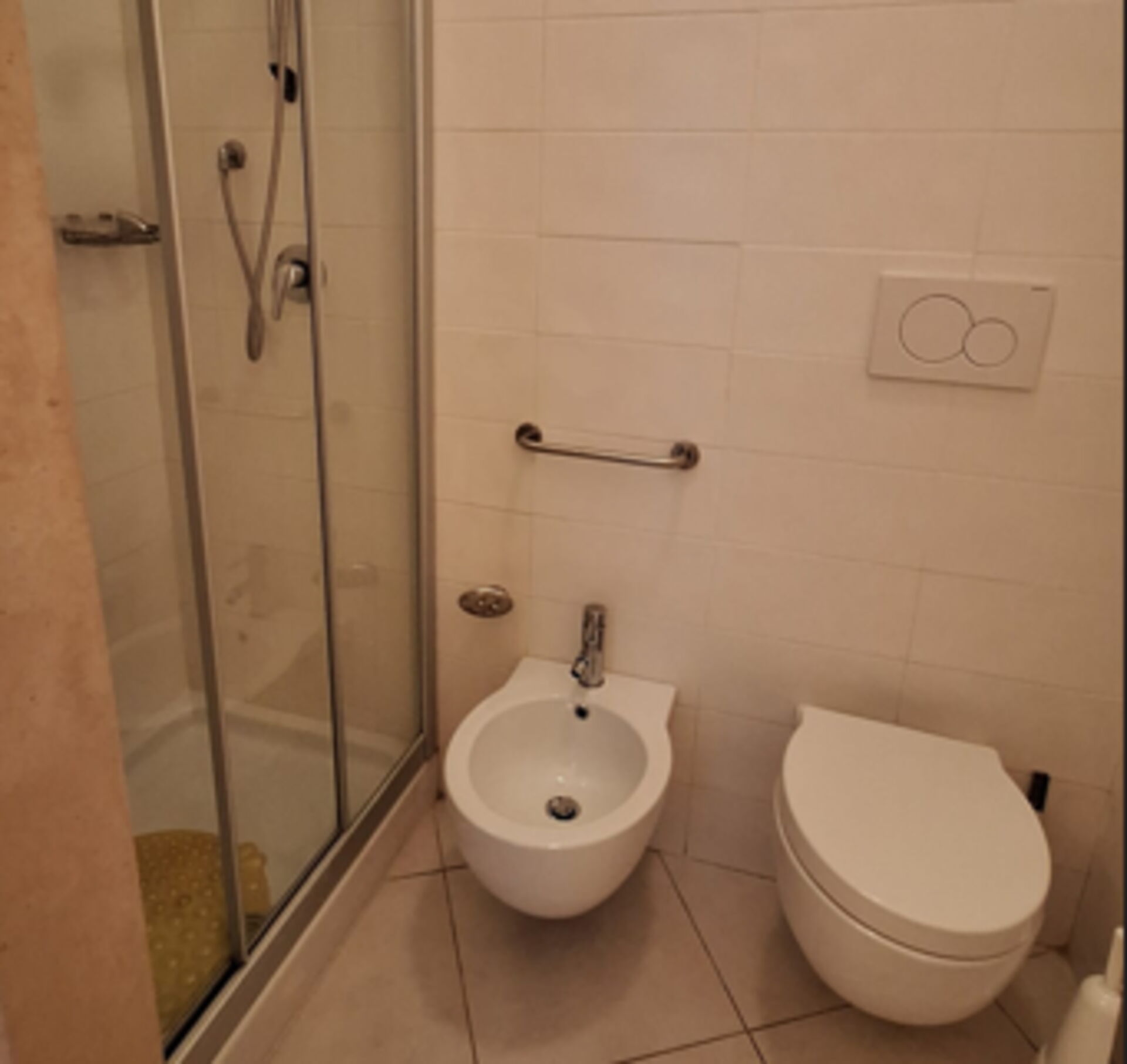 Badezimmer: Waschbecken, WC, Bidet, Dusche, Fön.