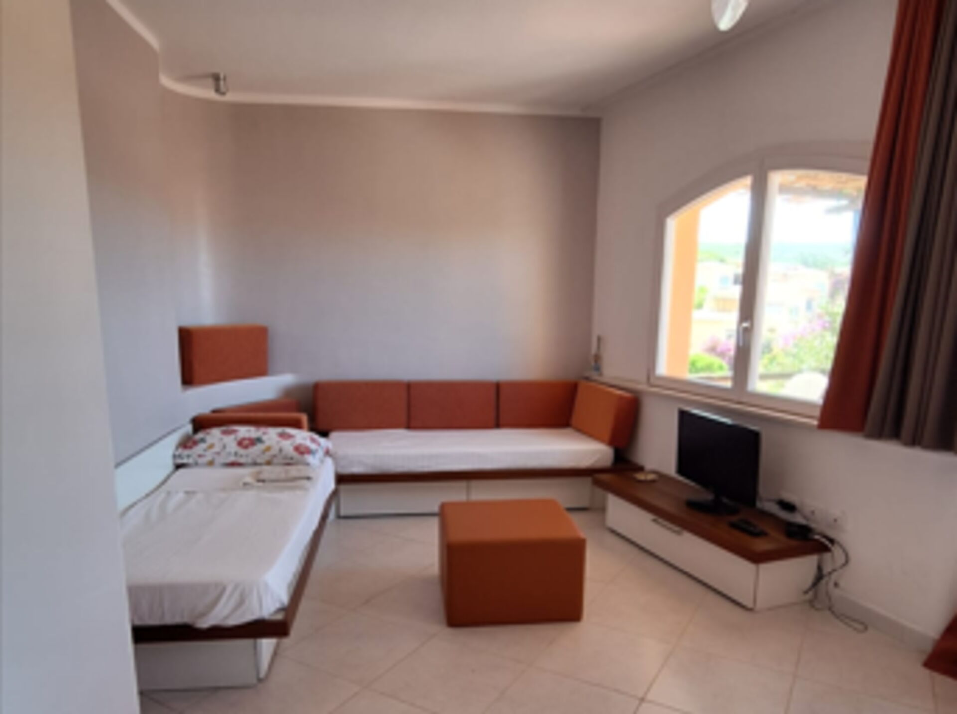 Wohnzimmer: Sofa bed (Breite: 1m, Länge: 1.9m), Klimaanlage, TV, Deckenventilator.