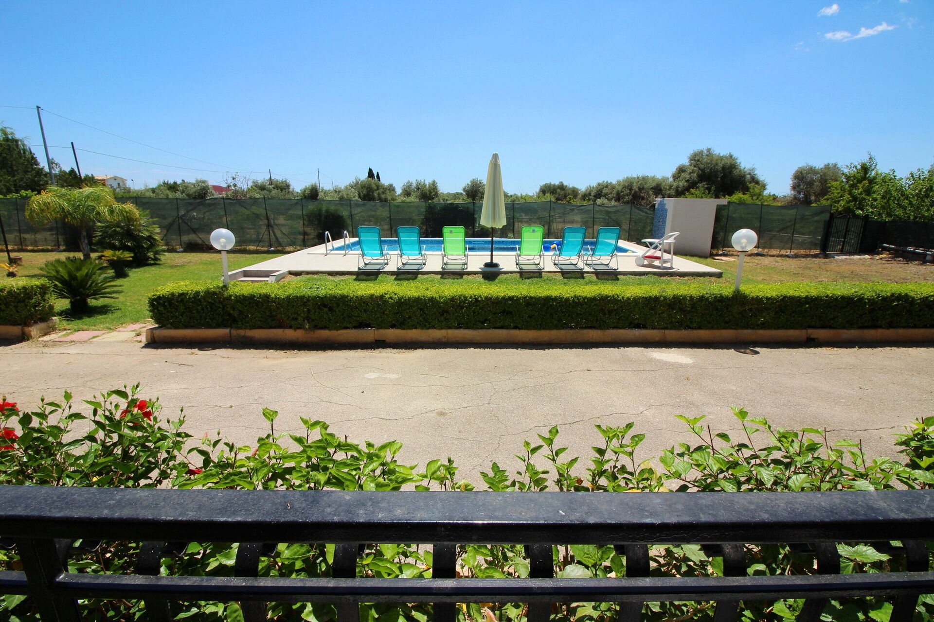 Garten: Schwimmbad (privat, Breite: 4m, Länge: 8m, Innen), Dusche, Grill, Außenbereich für das Essen im Freien, Esstisch, Gartenmöbel, Terrassenmöbel, Sonnenliege, umzäuntes Grundstück.