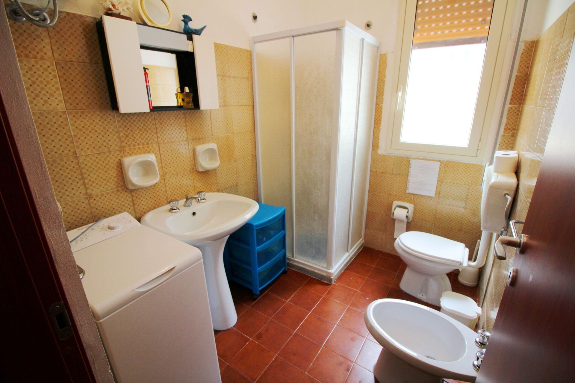 Badezimmer: Waschbecken, WC, Bidet, Dusche, Fön, Waschmaschine.