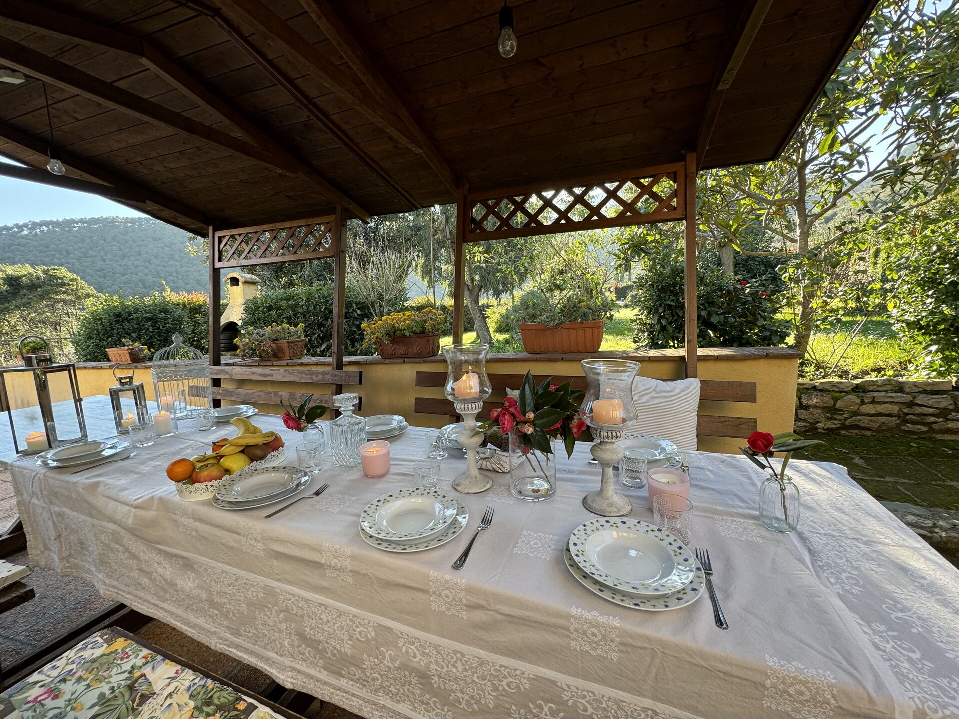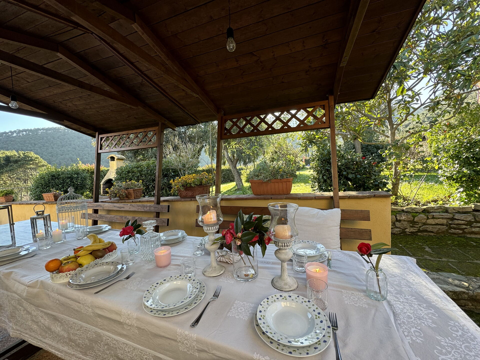 Veranda: Außenbereich für das Essen im Freien, Esstisch, Grill.