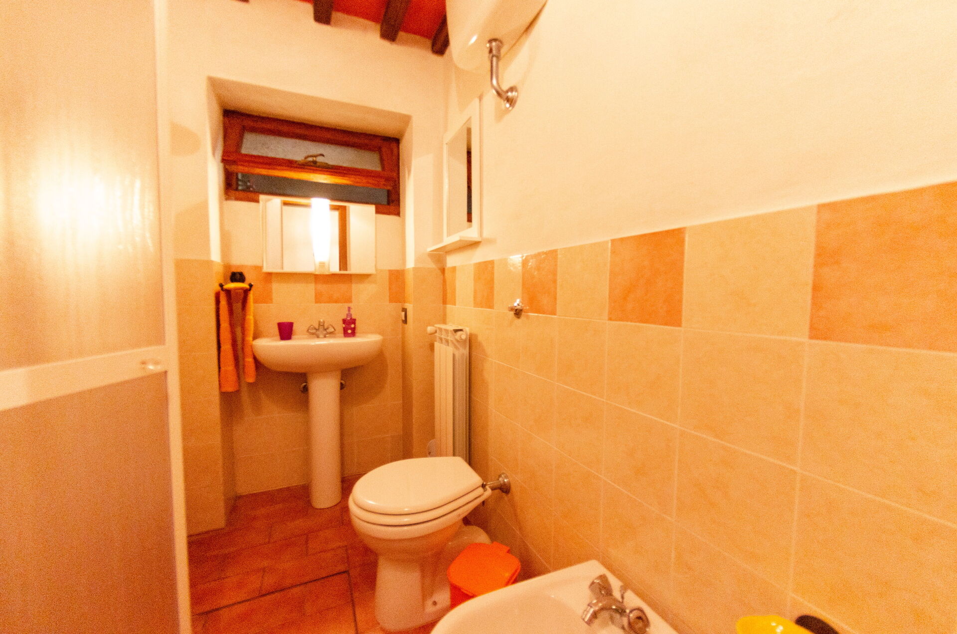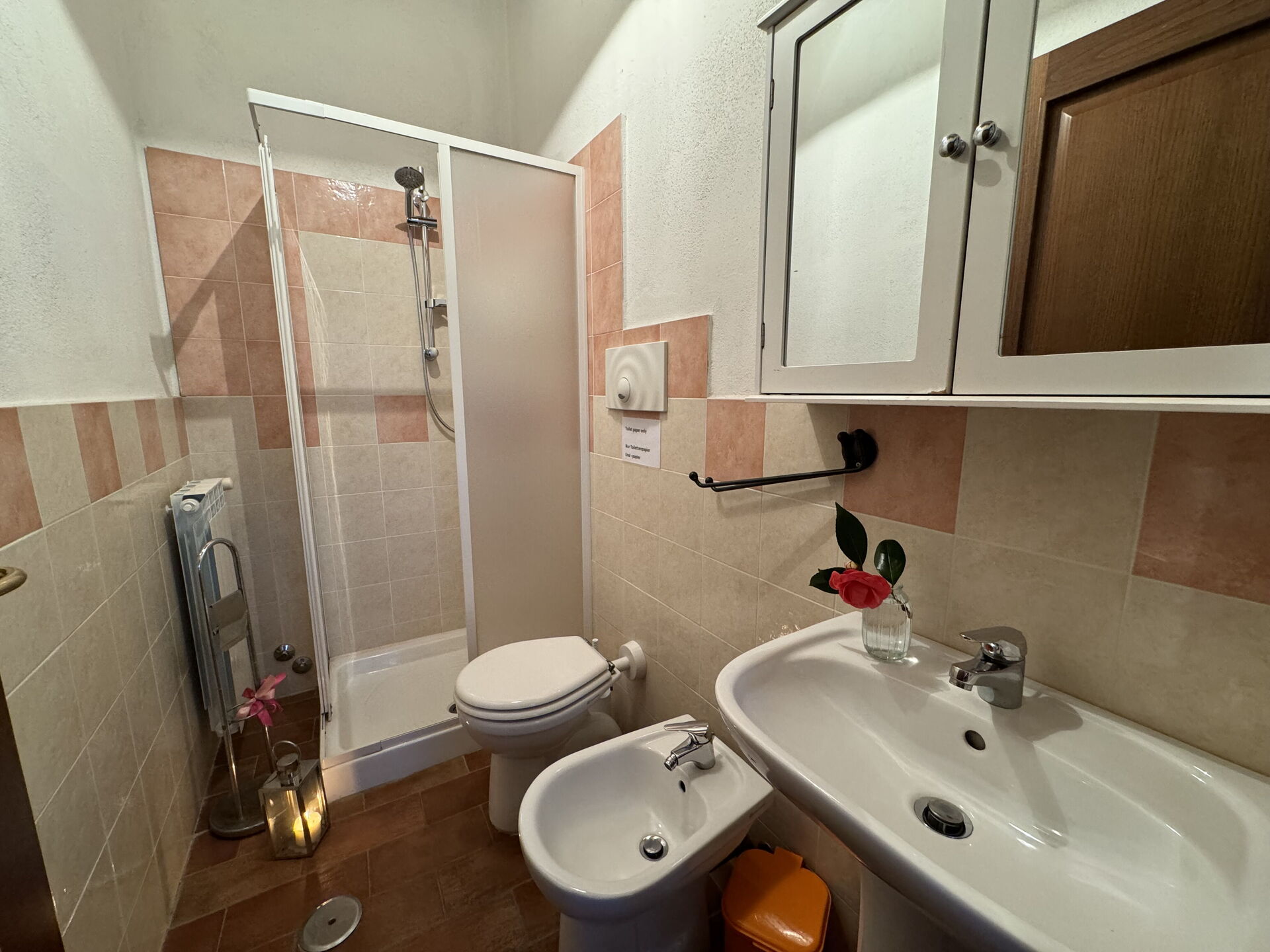 Badezimmer: Waschbecken, WC, Bidet, Dusche.