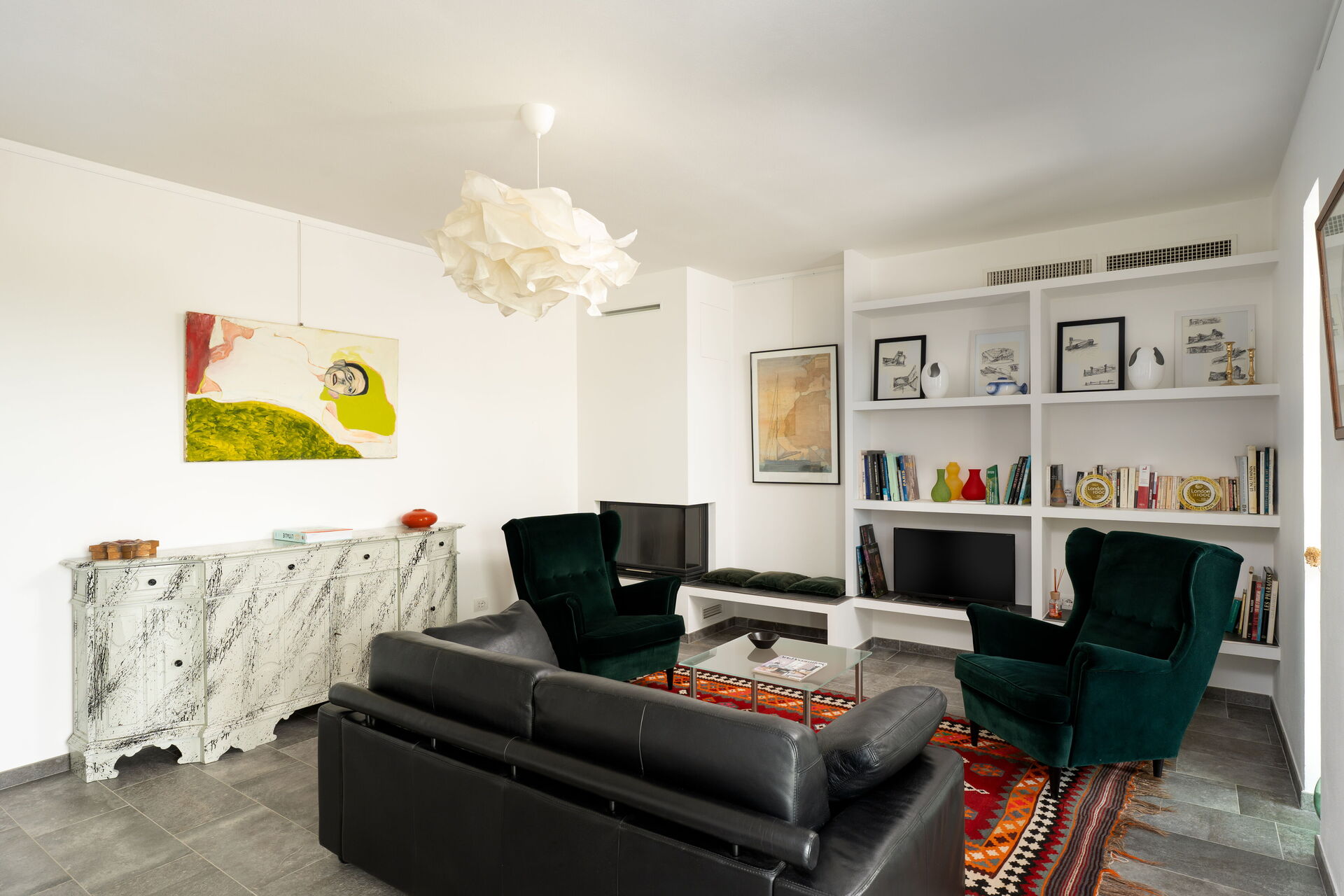 Wohnzimmer (26.27 m2): Sofa (Personen: 3), zwei Sessel, Kamin, WiFi Internet, Klimaanlage, Satelliten-TV, Fliegengitter, Ausgang auf den Garten.