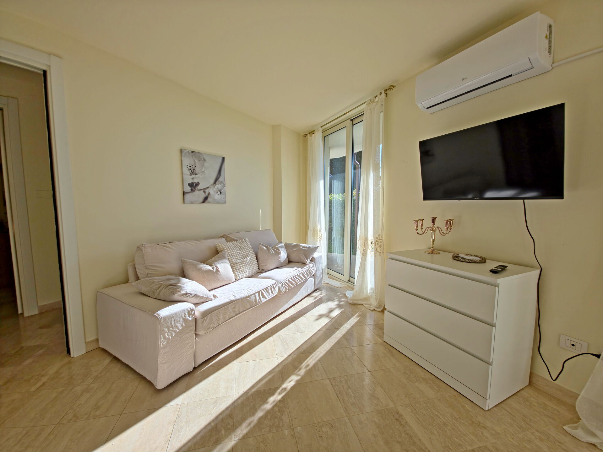 - Wohnküche mit: Sofa, Esstisch, Panoramafenstern mit Meerblick, Fernseher, 2-Platten-Induktionsherd, Kaffeemaschine, Toaster, Backofen und Klimaanlage.
