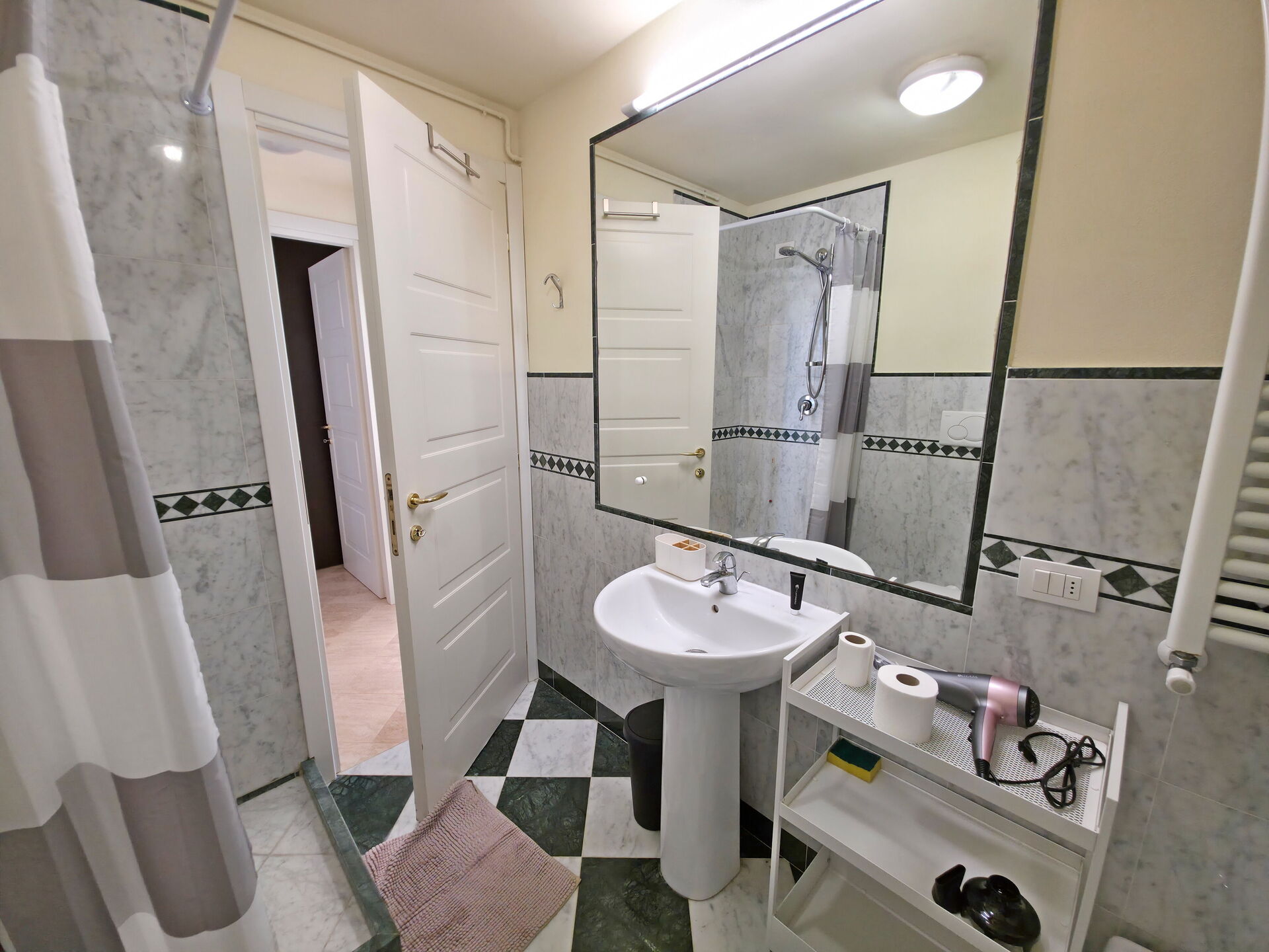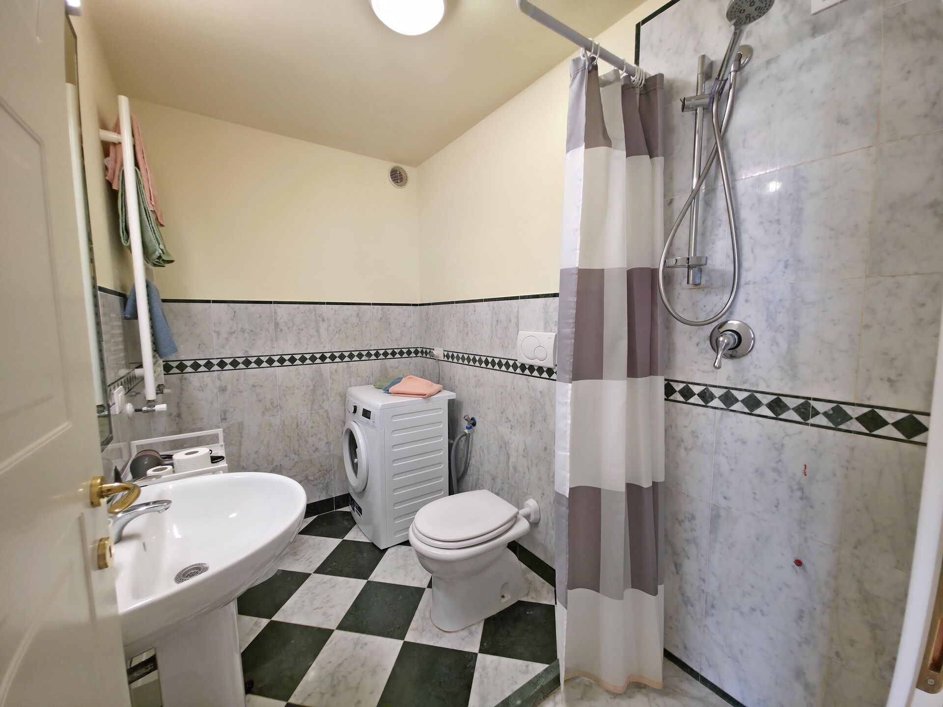 - Badezimmer mit Dusche, WC, Bidet, Waschbecken und Waschmaschine.