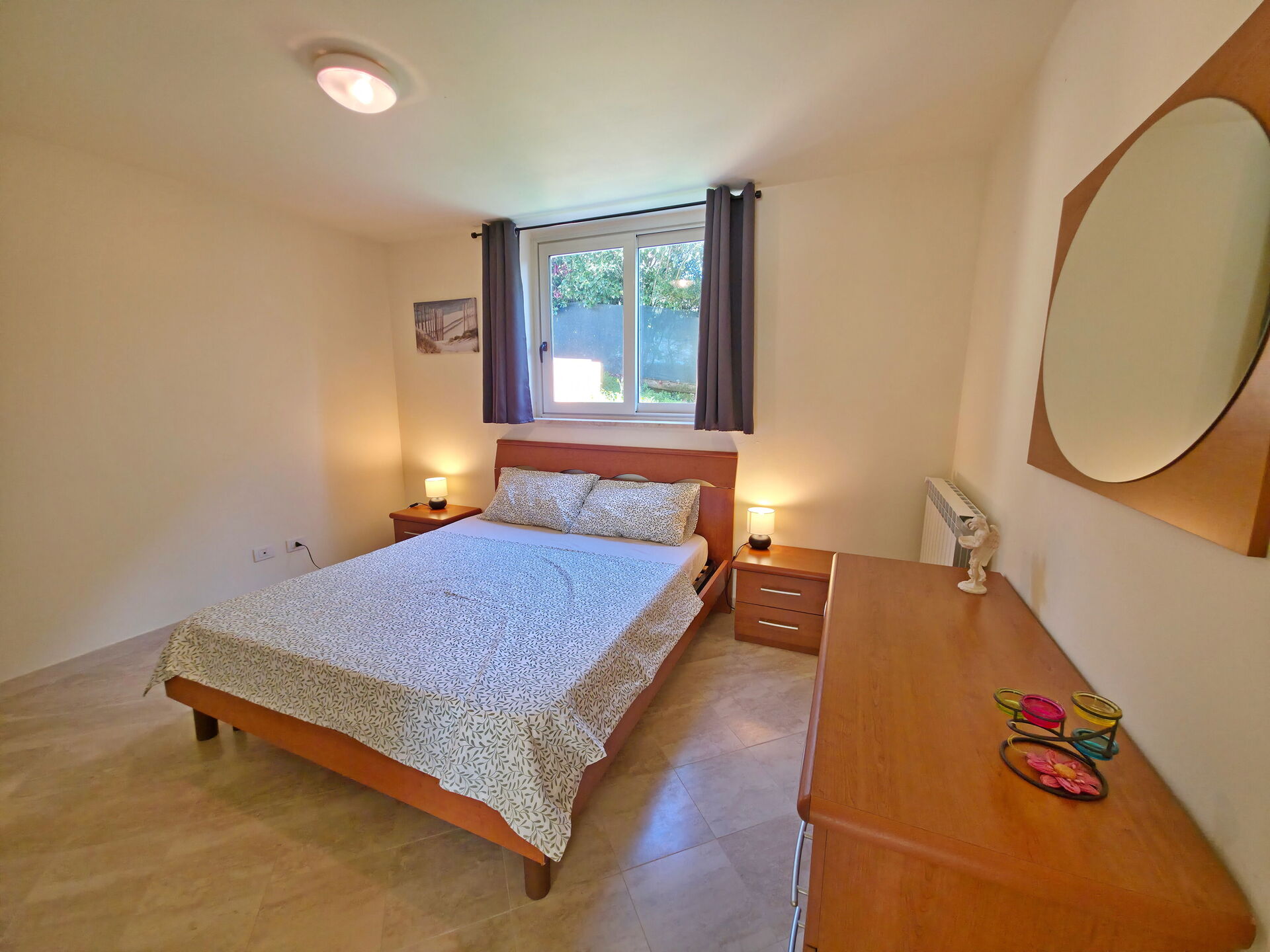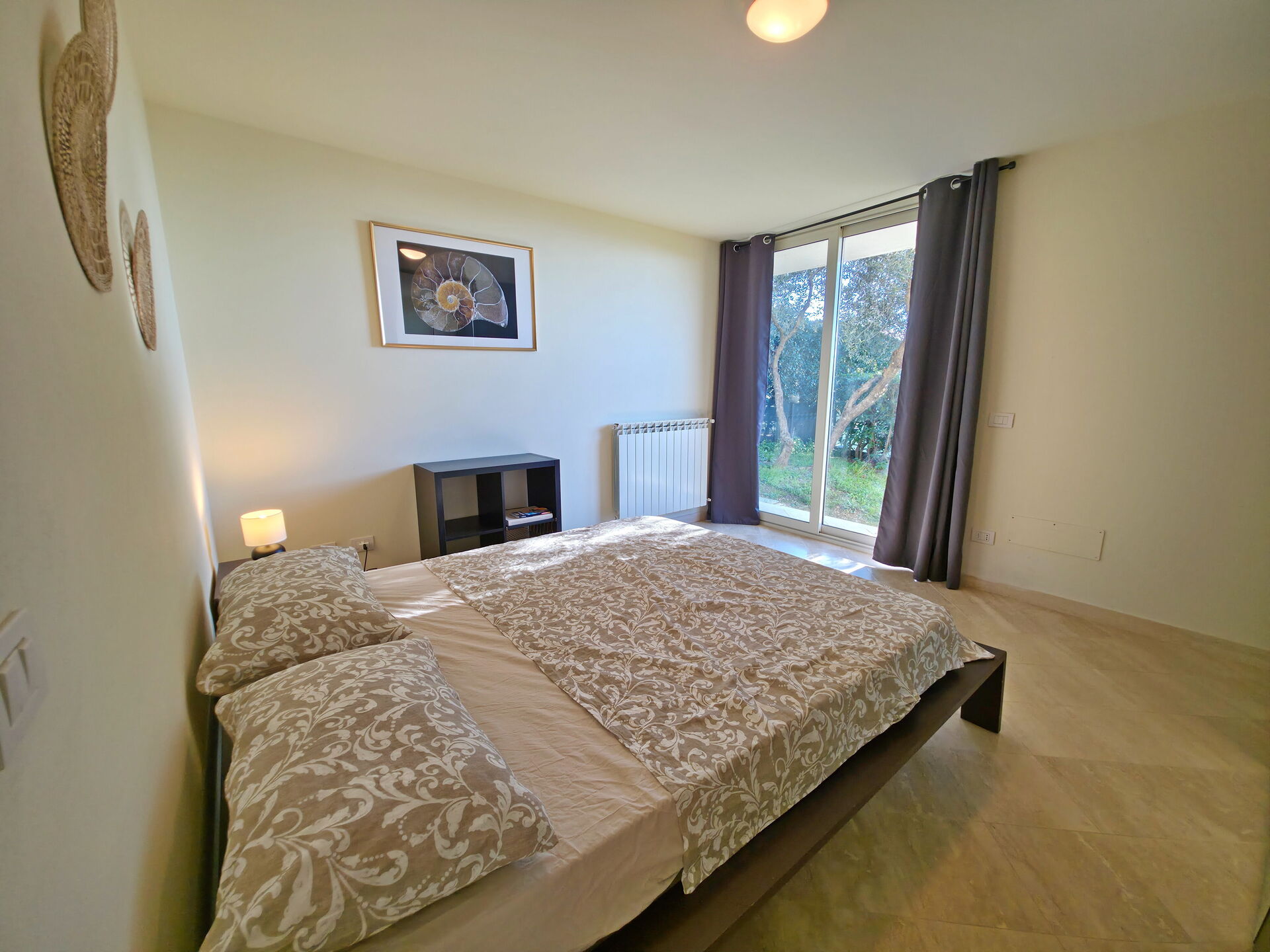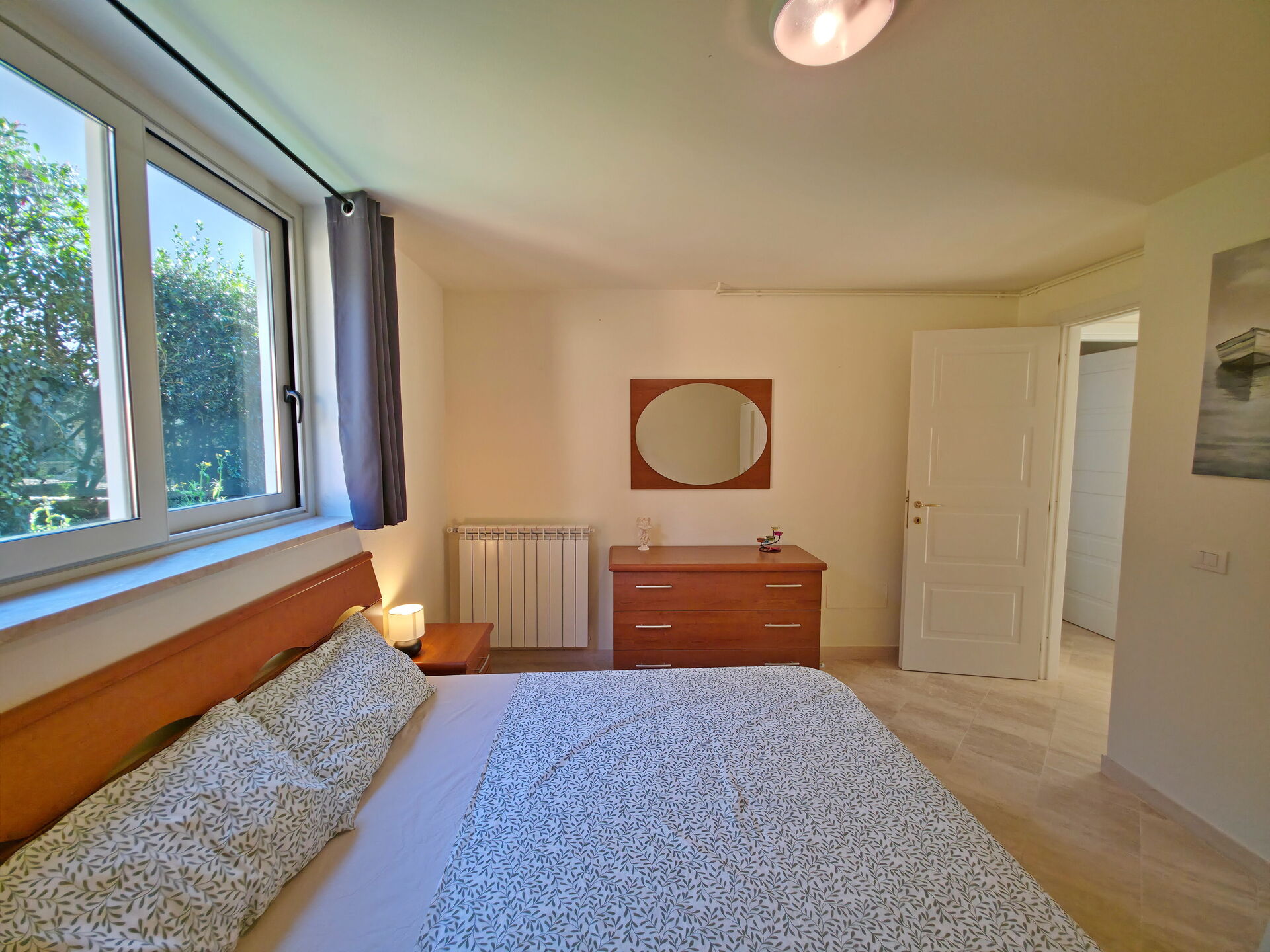 - Schlafzimmer mit Doppelbett und Zugang zum Garten.