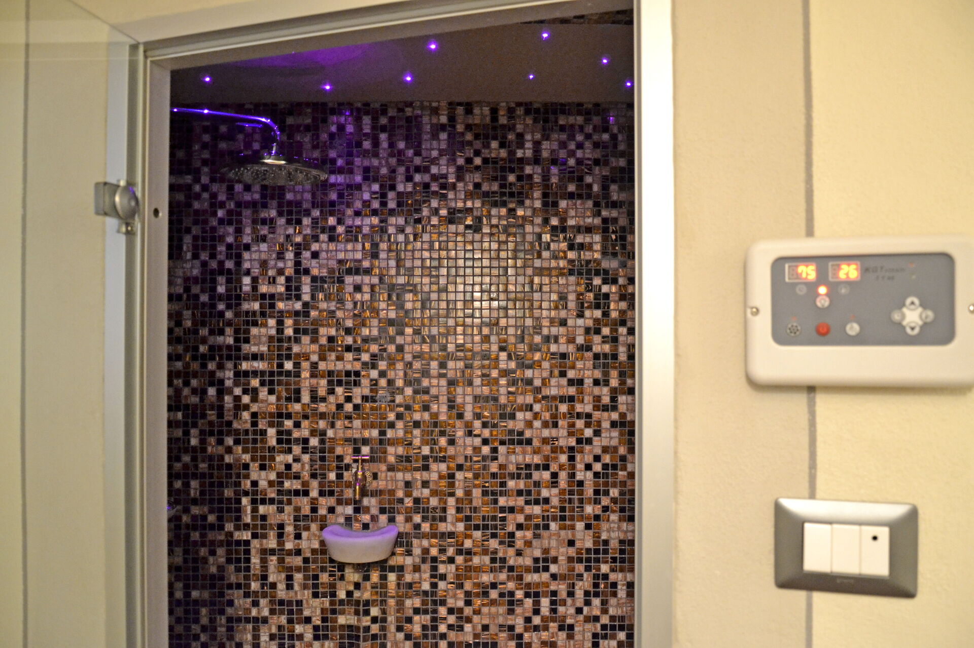 In der Dusche gibt es ein Türkisches Bad, Hintergrundmusik und eine Farbtherapie-Dusche.