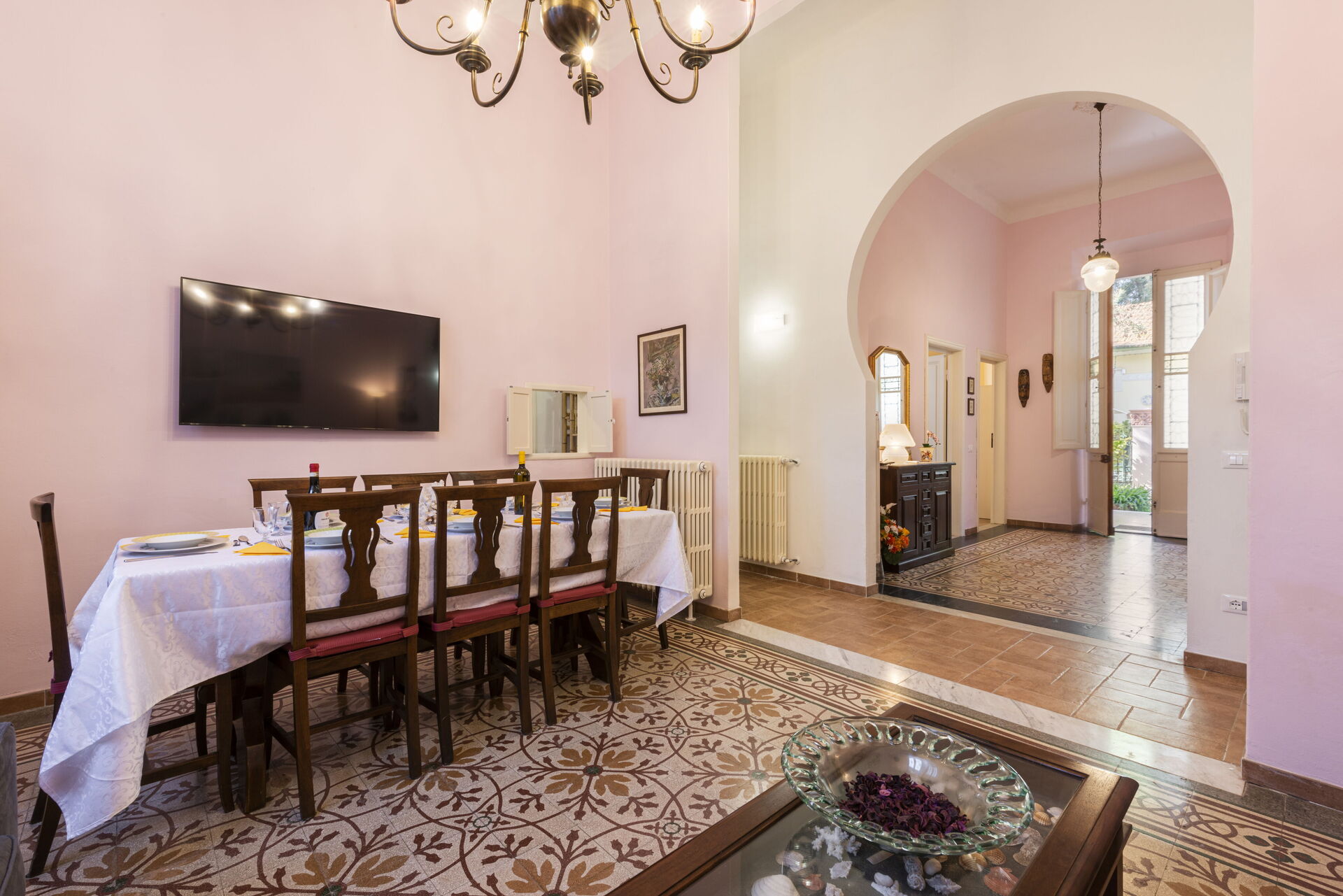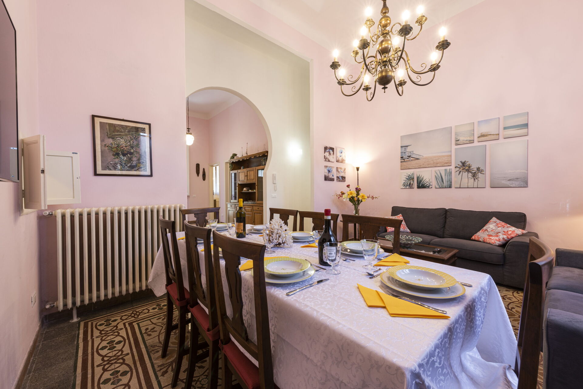 Wohnzimmer: zwei Sofas, Esstisch (Personen: 8), WiFi Internet, Klimaanlage, TV, Ausgang auf den Garten.