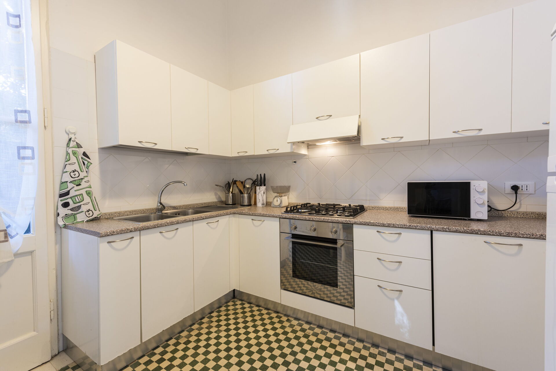 Küche: Esstisch (Personen: 2), Spülmaschine, Kühlschrank, Tiefkühler, Mikrowelle, Herd, Ofen, Toaster, Italienische Kaffeemaschine, WiFi Internet, Ausgang auf den Garten.