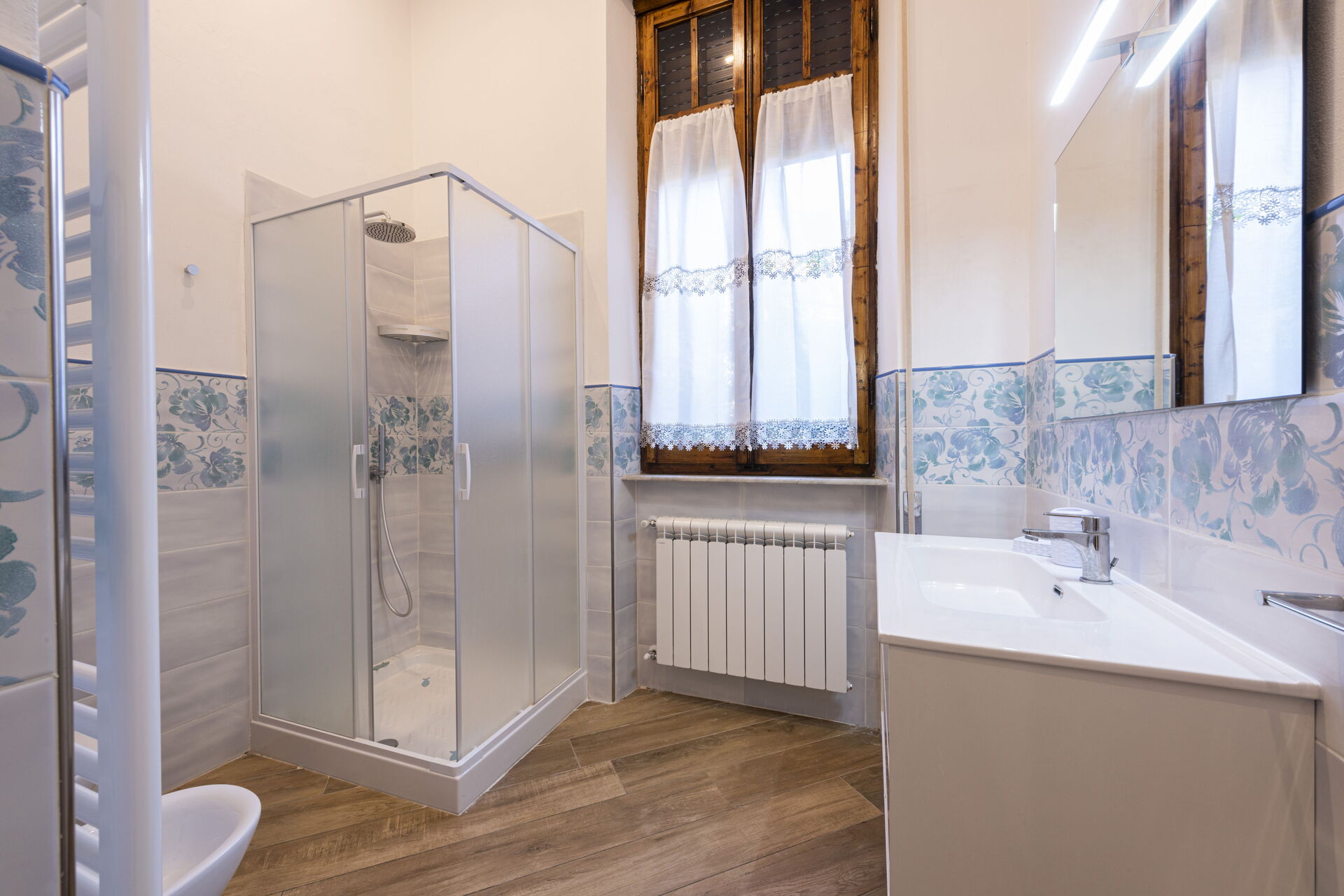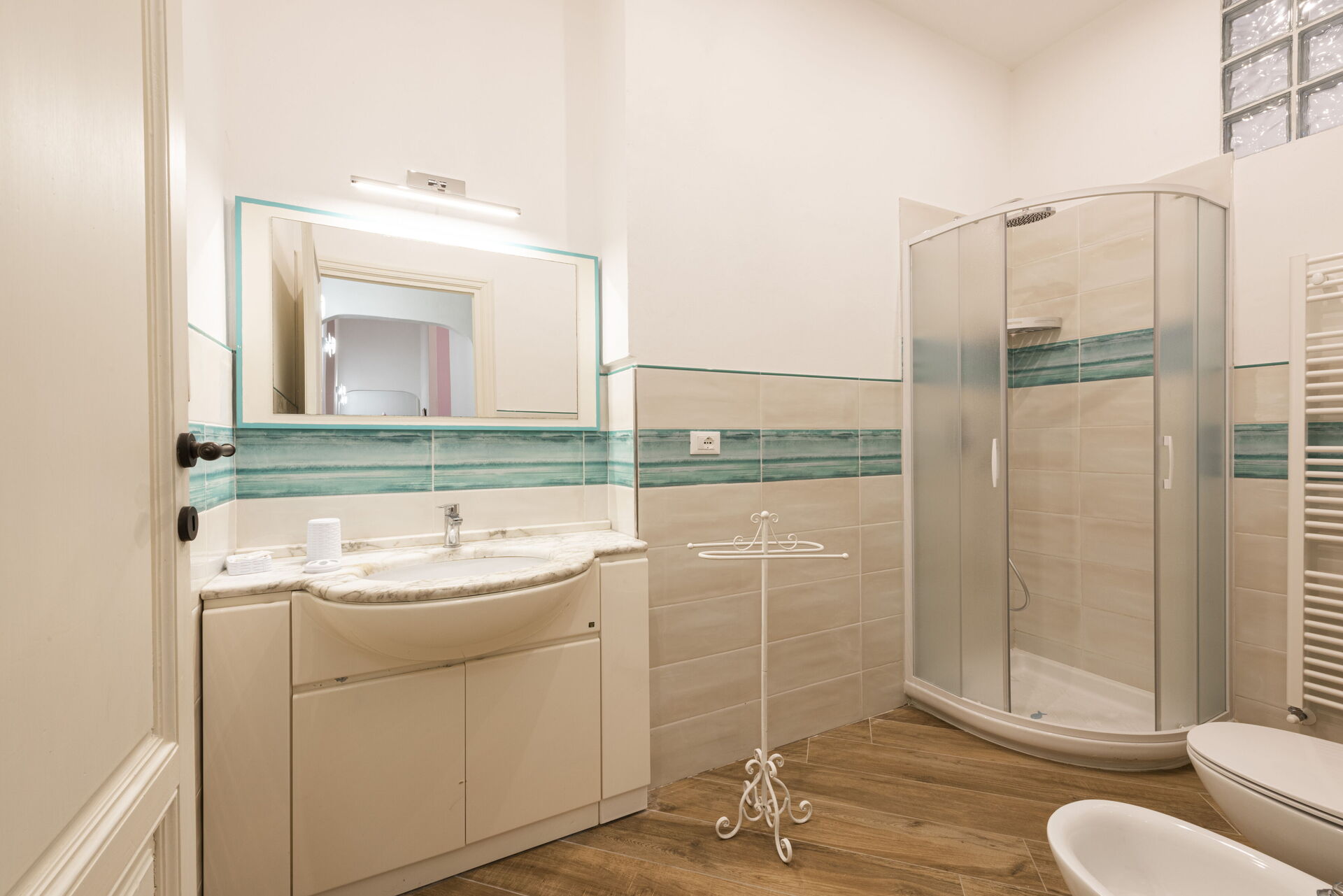 Badezimmer 1: Waschbecken, WC, Bidet, Dusche.
