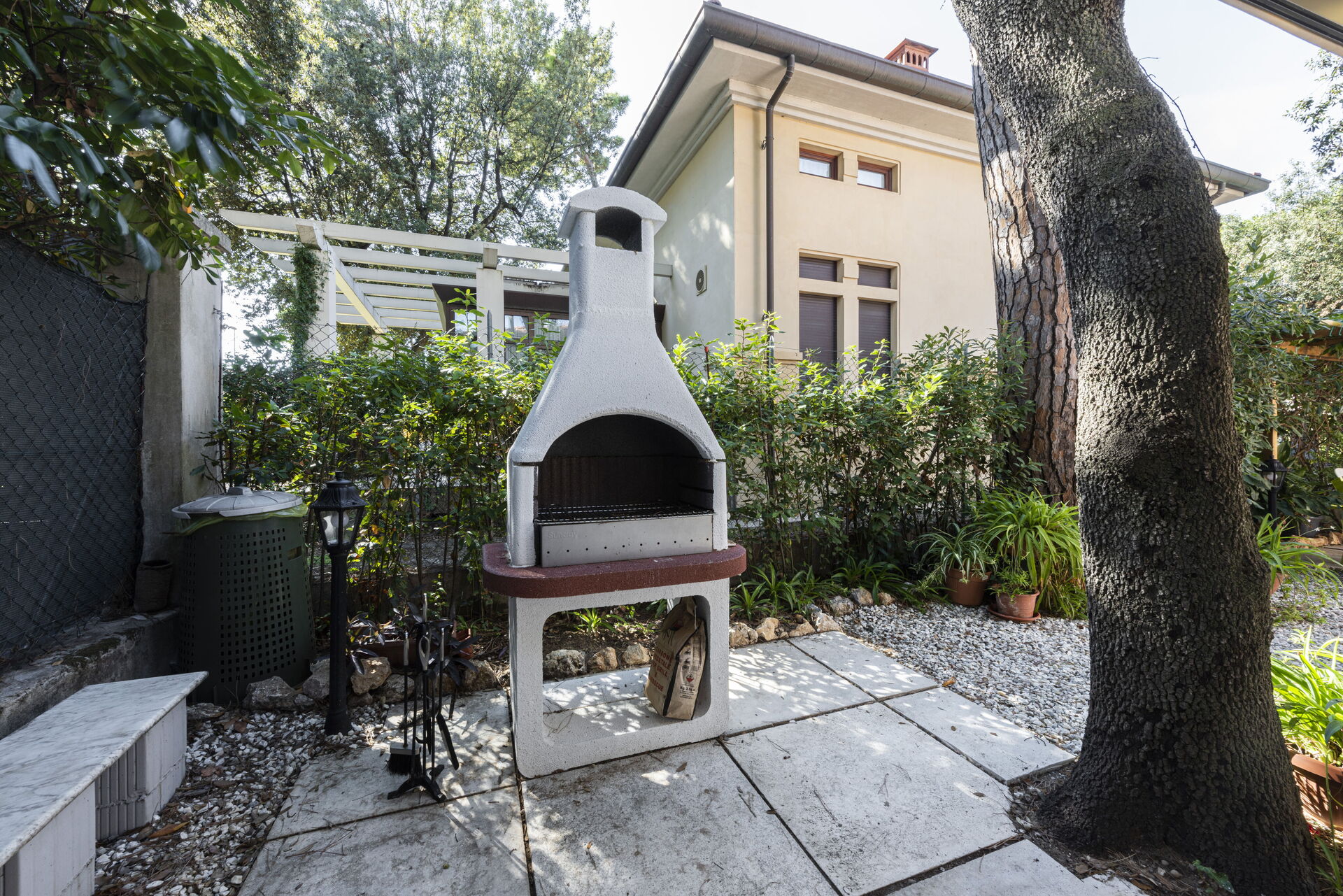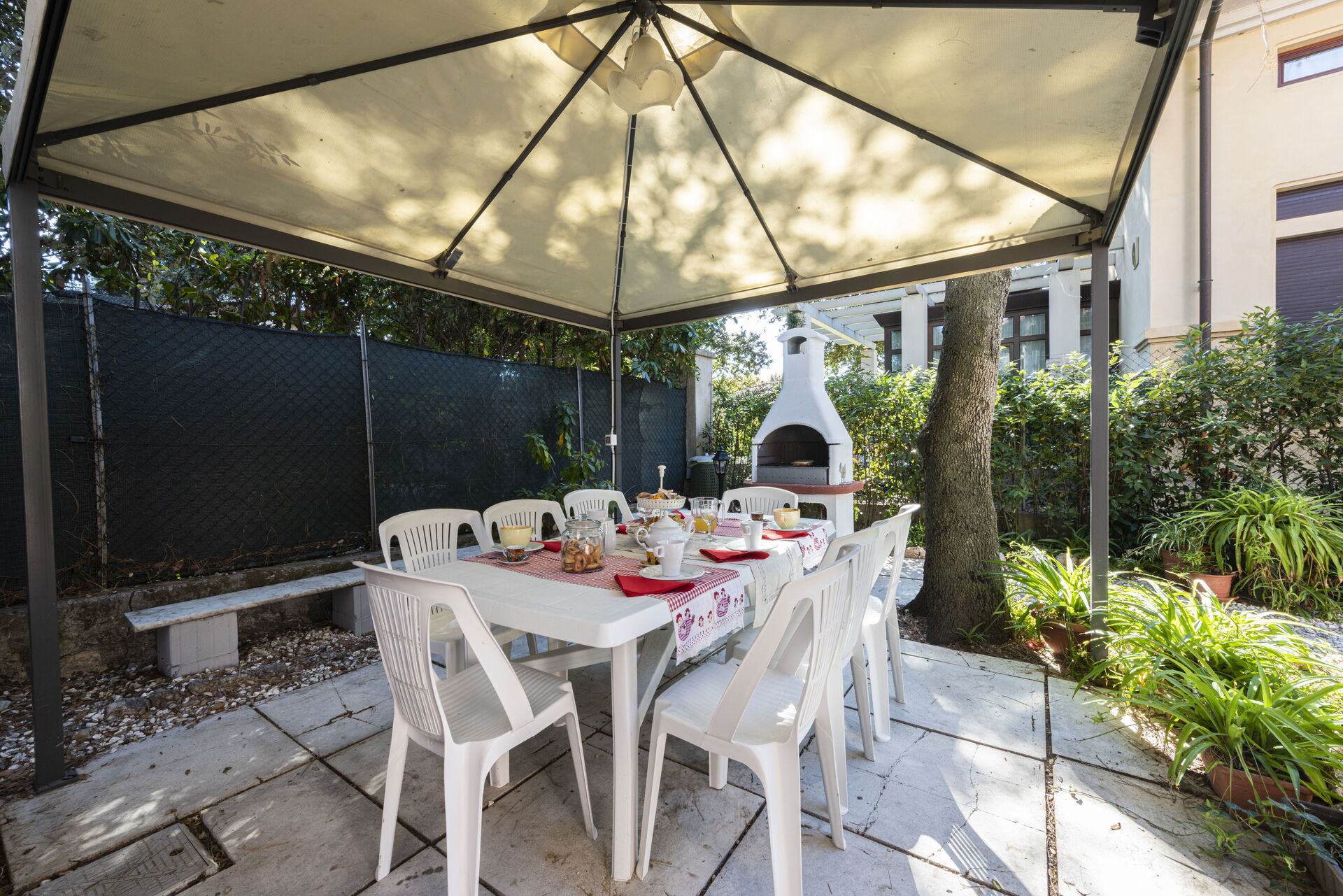 Garten: Grill, Außenbereich für das Essen im Freien, Esstisch (Personen: 8), Pavillon, Gartenmöbel, eingezäunt.