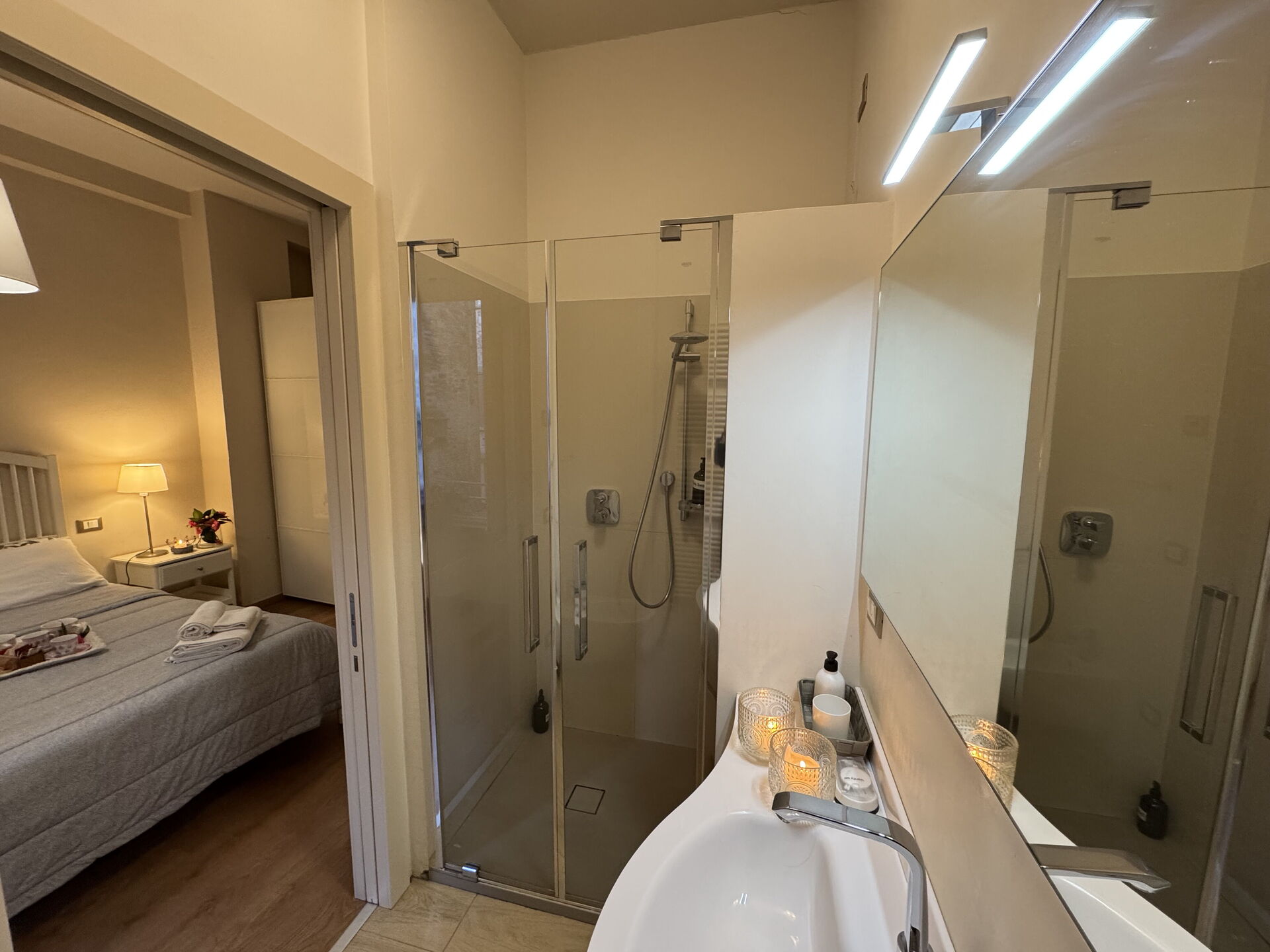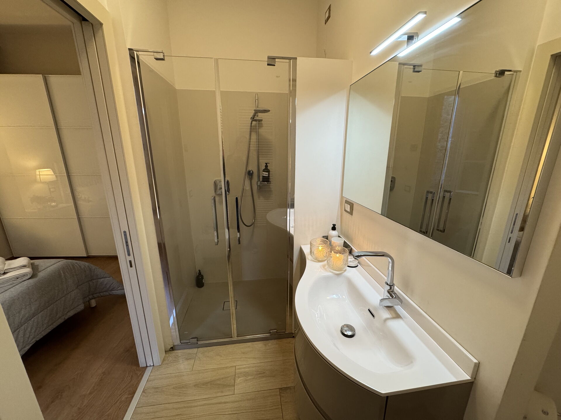 Schlafzimmer mit Bad: Doppelbett, Klimaanlage, Waschbecken, WC, Bidet, Dusche.