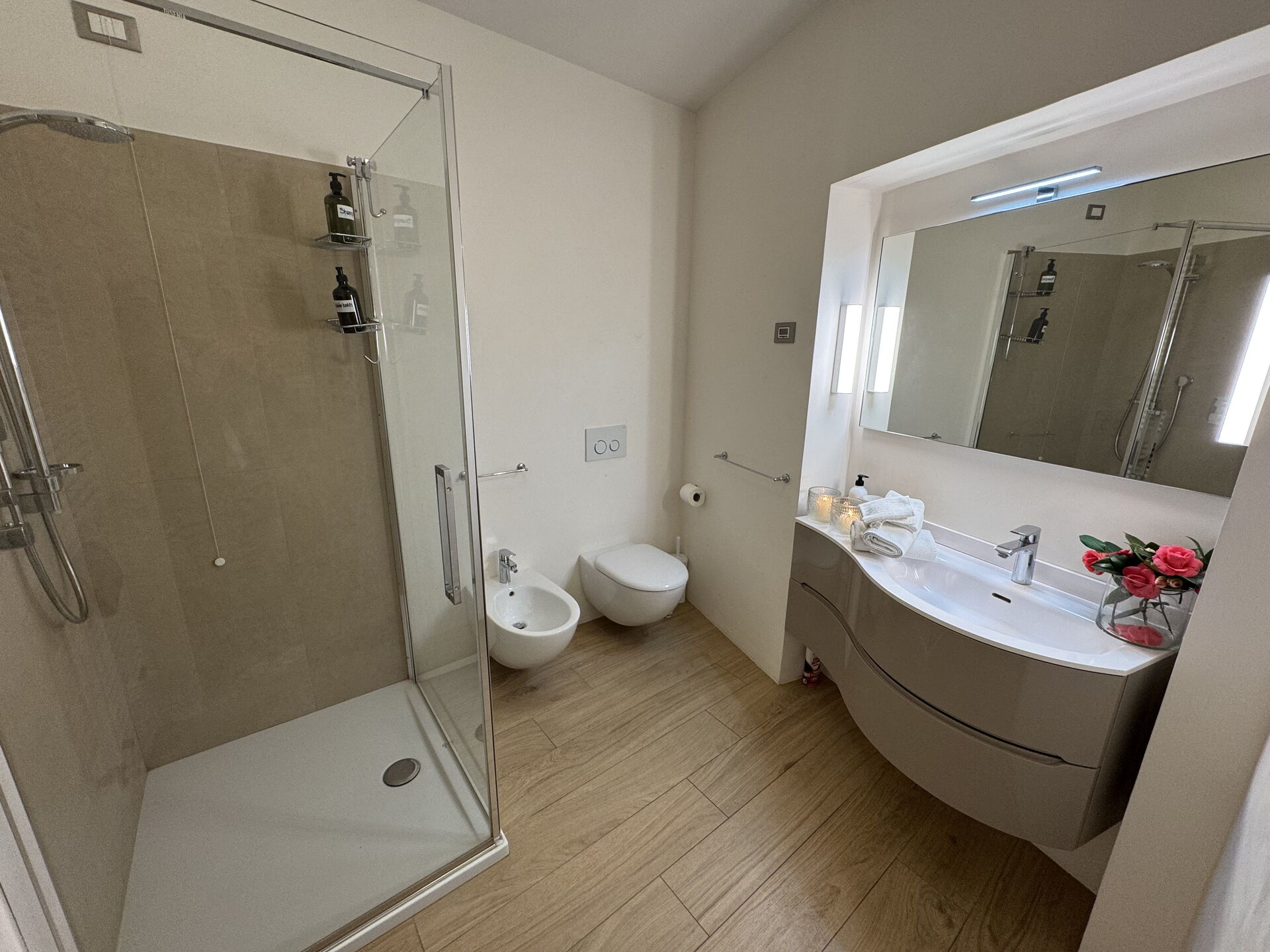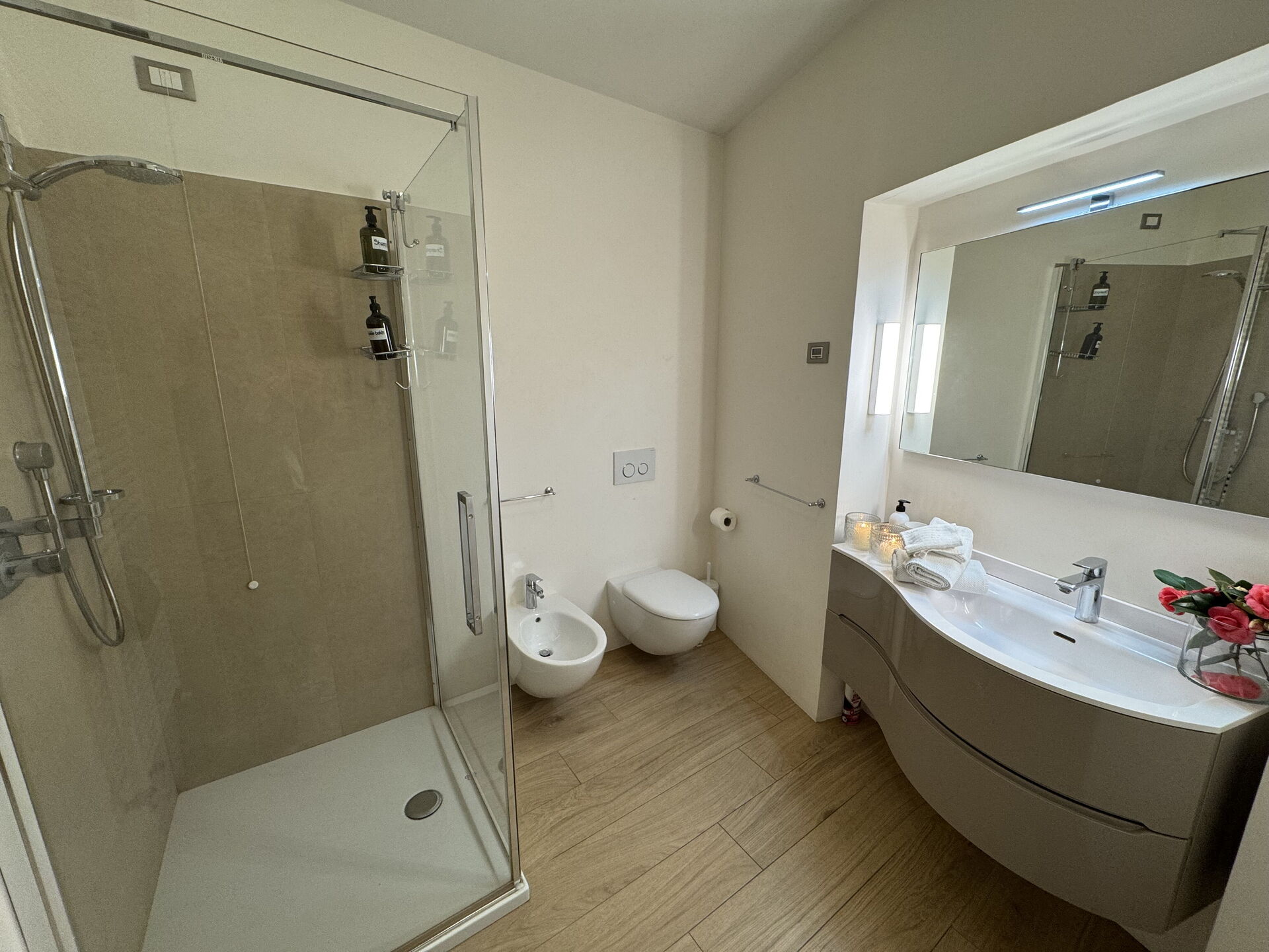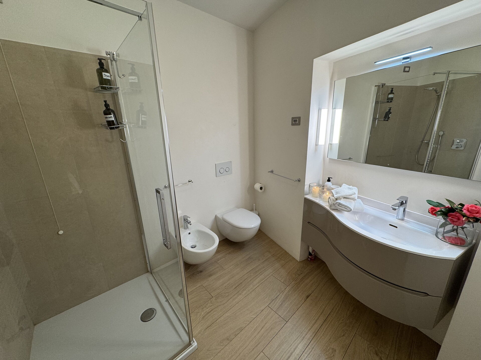Badezimmer: Waschbecken, WC, Bidet, Dusche.