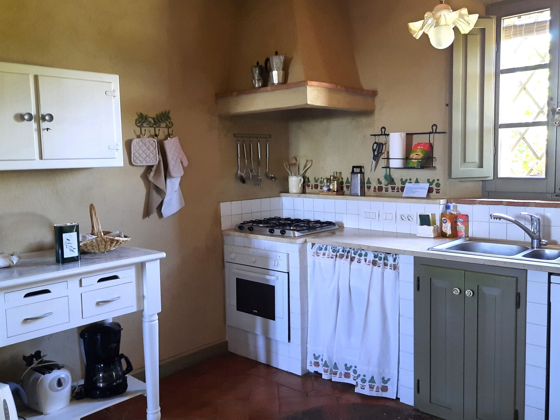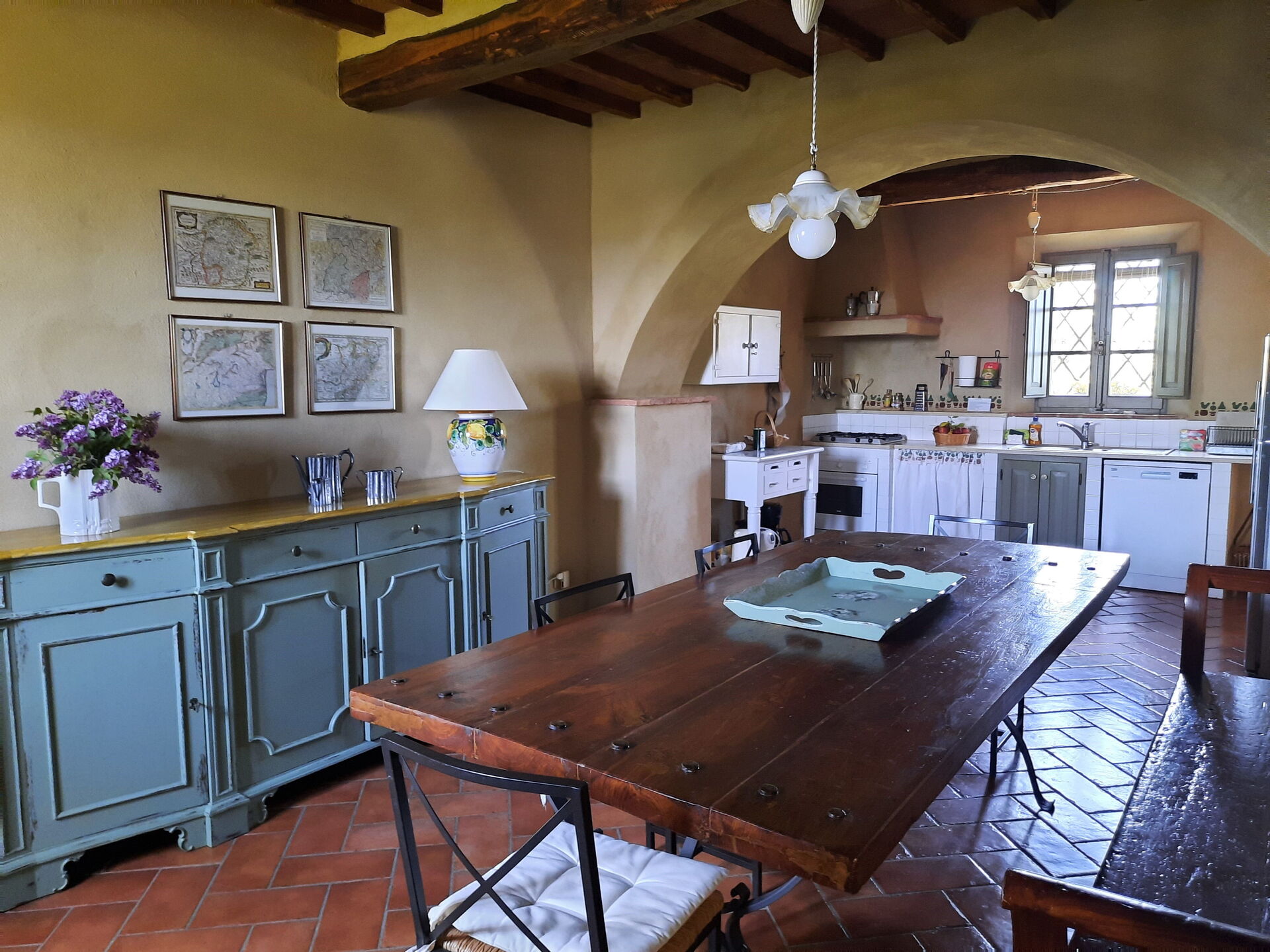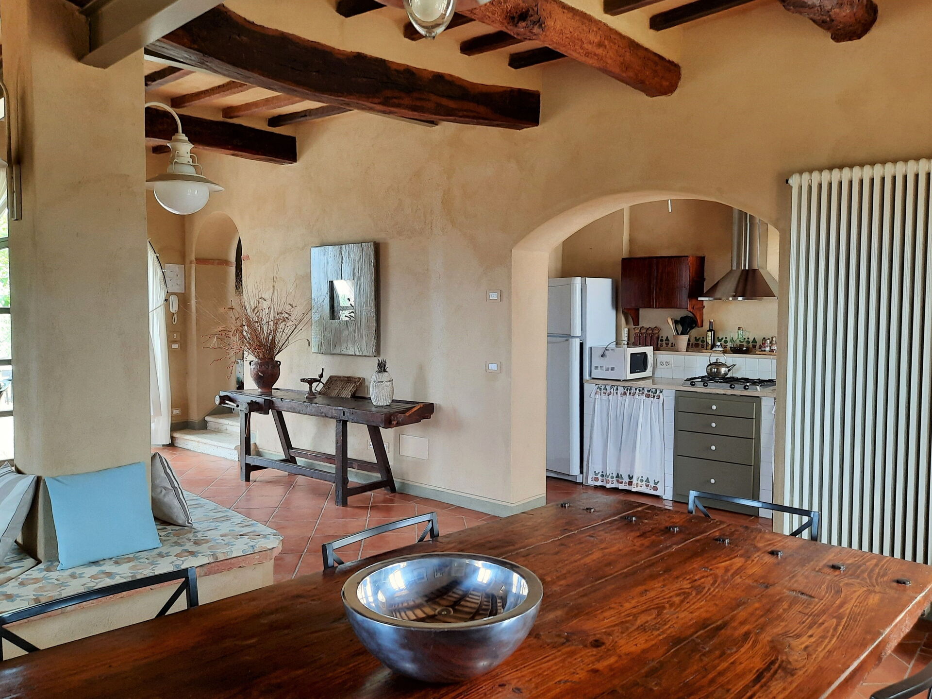 Wohnküche: gut ausgestattete Küche, Esstisch (Personen: 10), Spülmaschine, Kühlschrank, Tiefkühler, Mikrowelle, Herd, Toaster, Bügeleisen, Italienische Kaffeemaschine, Amerikanische Kaffeemaschine, Waschmaschine, Sofa, Sessel, Kamin, WiFi Internet, Internet, Fliegengitter, Kinderhochstuhl, tragbarer Ventilator, Ausgang auf den Garten, Ausgang auf den Patio.