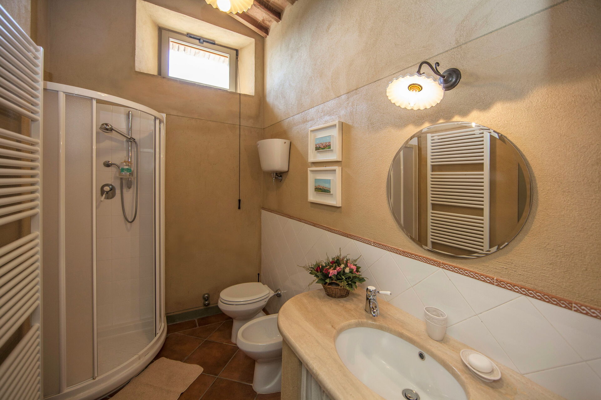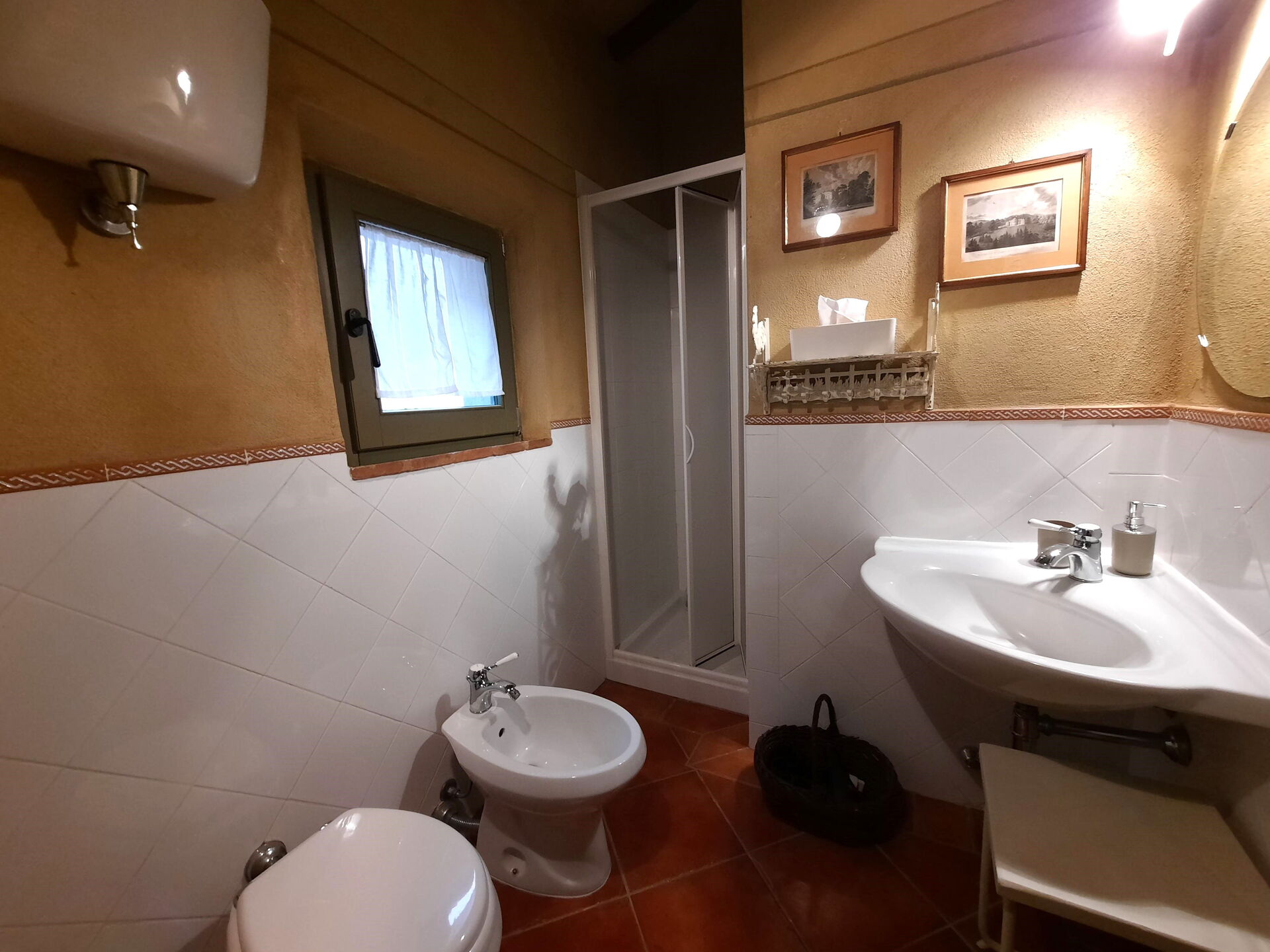 Badezimmer 1: Waschbecken, WC, Bidet, Dusche, Fön, Fliegengitter.
